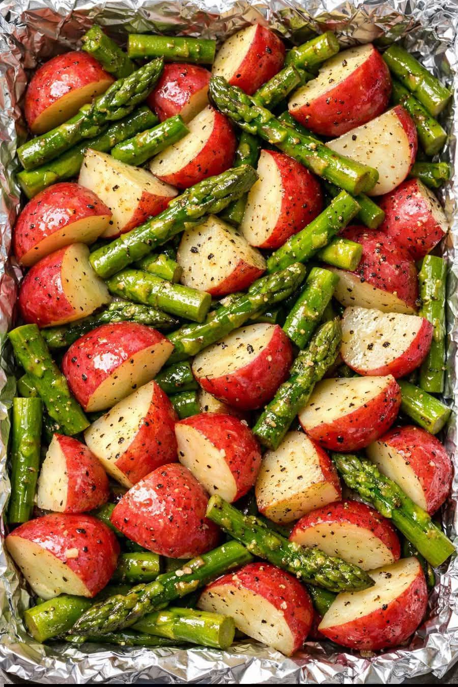 Inspiré des repas traditionnels du dimanche, ce plat associe de tendres pommes de terre rouges et des asperges fraîches, le tout sauté à l'huile d'olive, au sel marin et au poivre noir. Le résultat ? Un accompagnement nutritif, sans gluten et végétarien, qui se marie à merveille avec du poulet, du bœuf, du poisson ou même des plats principaux végétaliens.