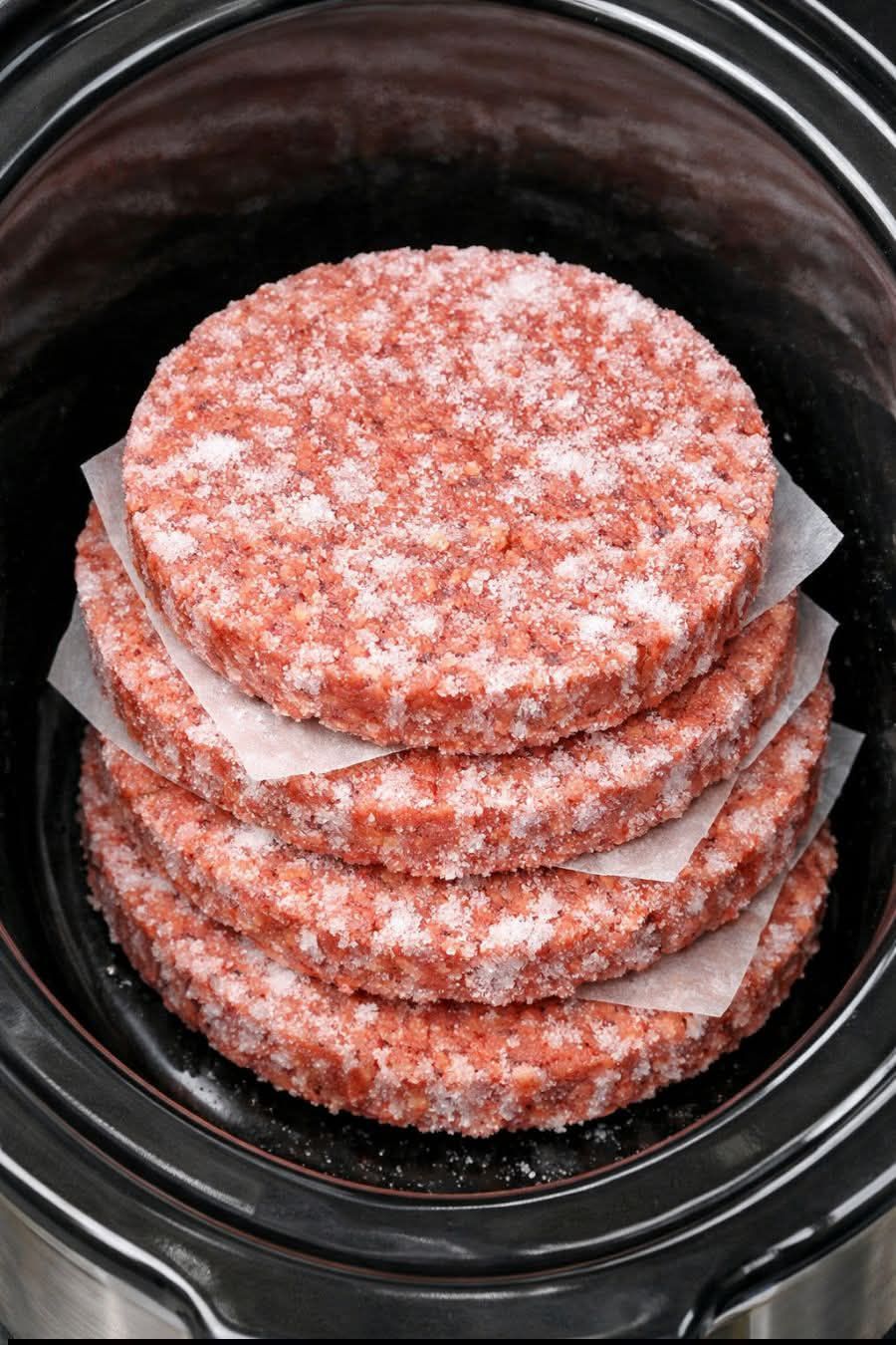 Placez les galettes de hamburger congelées au fond de votre mijoteuse, en les empilant uniformément. Inutile de les décongeler.