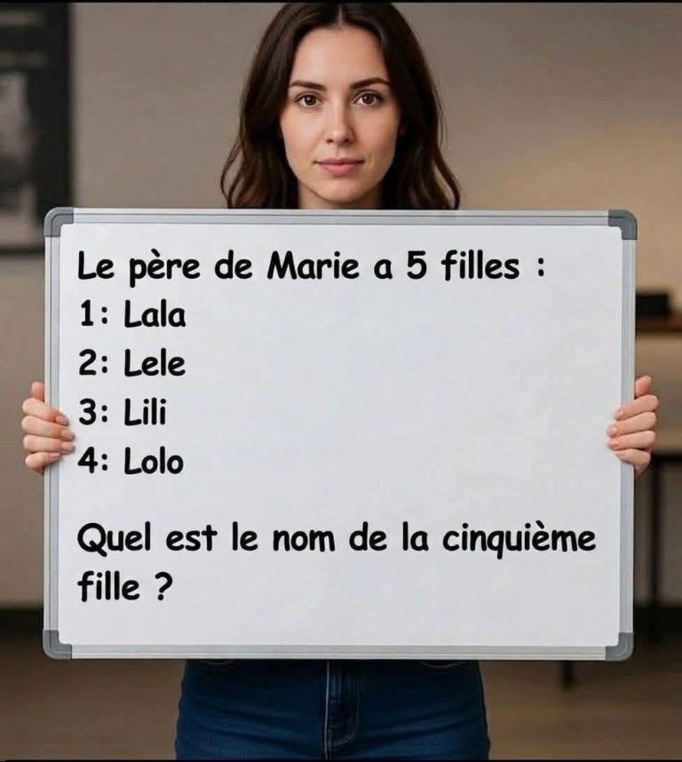 Quel est le nom de la cinquième fille ?Clic sur le Lien pour La réponse Ouadie RhabbouronApril 21, 2026 Tekst: Le père de Marie a 5 wypełnień: Lala Lele Lili Lolo Quel est le nom de la cinquième fille? Rozwiązanie Suivante »»
