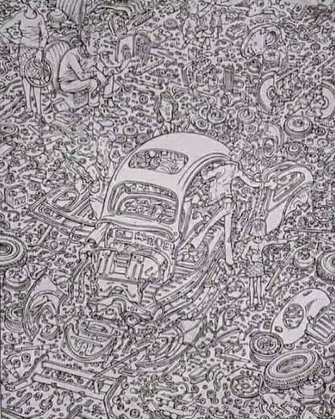 Au premier coup d’œil, cette illustration semble représenter un simple fouillis de pièces automobiles, de roues et d’éléments mécaniques. Mais si vous prenez le temps d’observer attentivement, vous distinguerez six personnages et un matou habilement camouflés. Le décor d’un atelier de démolition sert d’écrin à cette énigme visuelle où chaque composant a son rôle à jouer.